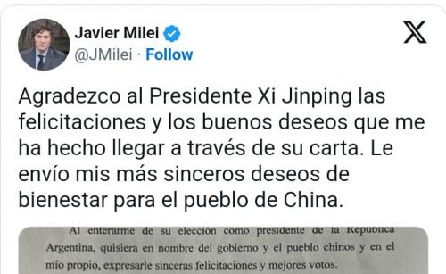 Xi Jinping felicita a Milei y recibe respuesta más suave