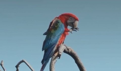 Cuatro pichones guacamayos rojos vuelan en libertad
