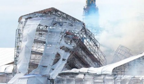 Colapsa fachada calcinada de antigua Bolsa de Copenhague